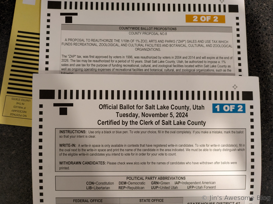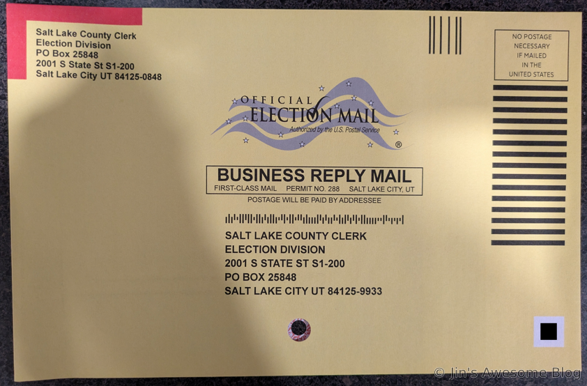 美國總統大選在即,由於先生居住的州實施通訊投票,最近也收到了投票信件(official election mail),裡面其實很簡單,就只是聯邦和地方選舉的投票單。投票單上面關於候選人的項目也很簡單,只有分成不同頭銜,也就是這些候選人要選什麼、候選人的所屬政黨和名字,然後一些注意事項,比如說教你要怎麼填寫選票、選票上的write-in是做什麼用的等等。另一張則是關於州法的一些條文新增,詢問選舉人同不同意,會讓我聯想到地方的公投。
